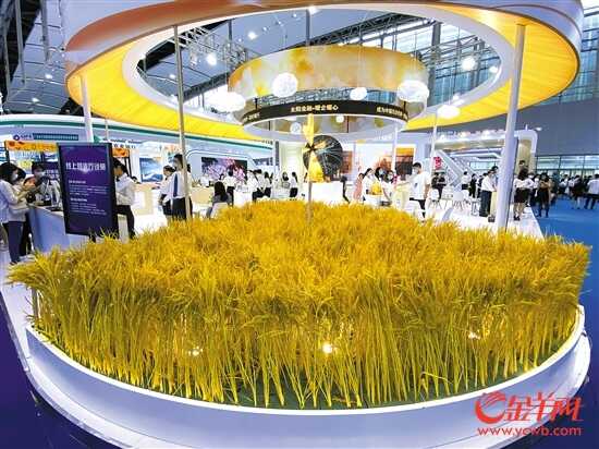 广州农商银行的风格堪称最“接地气”——展厅正门处辟出一块约十平方米的稻田,稻田底部安上了暖黄色的灯,在灯光照耀下,丰收的稻田熠熠生辉。稻田中间还竖着会旋转的发光风车,非常吸引眼球,引来了大批观众拍照和合影。
